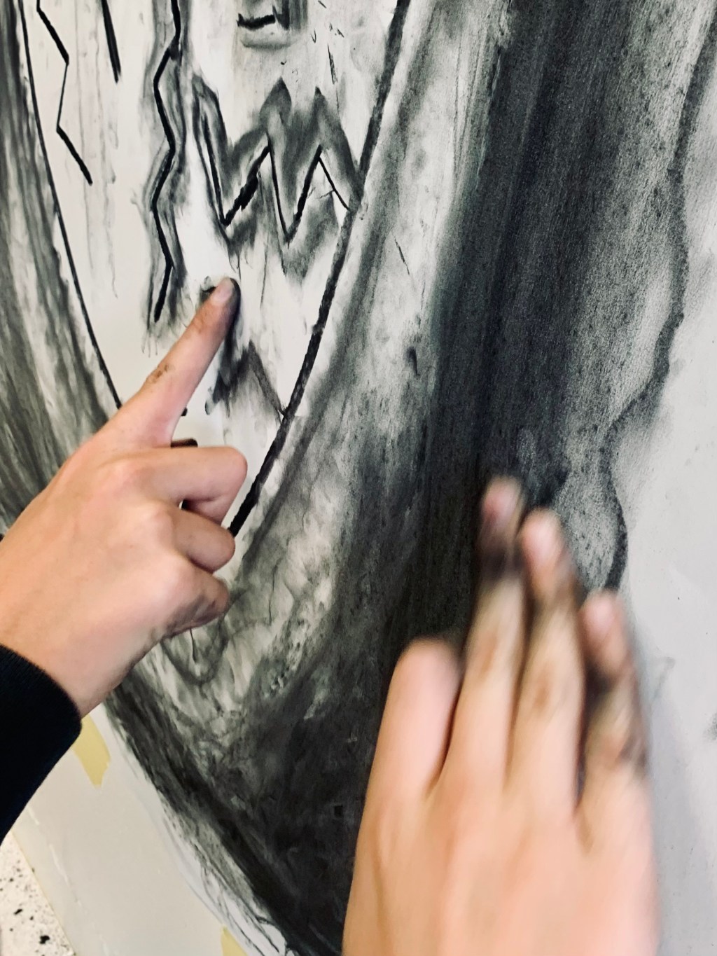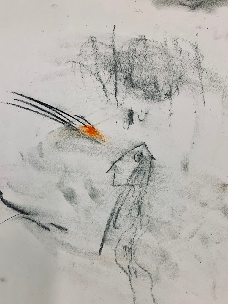 Beim Arbeiten mit Zeichenkohle und mit gefundenen natürlichen Materialien gab es dann Raum, mit ungewöhnlichen Möglichkeiten zu experimentieren um Spuren zu hinterlassen, dem eigenen Erleben nachzuspüren und auch ganz deutlich Haltungen zum Ausdruck zu bringen.